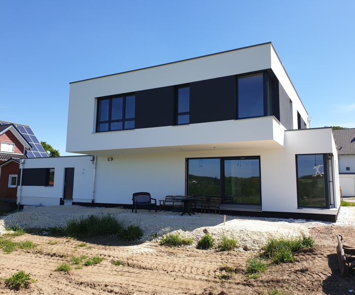 Wände, Fassade und Dach außen komplett fertig, inkl. Fenstern und Außentüren.